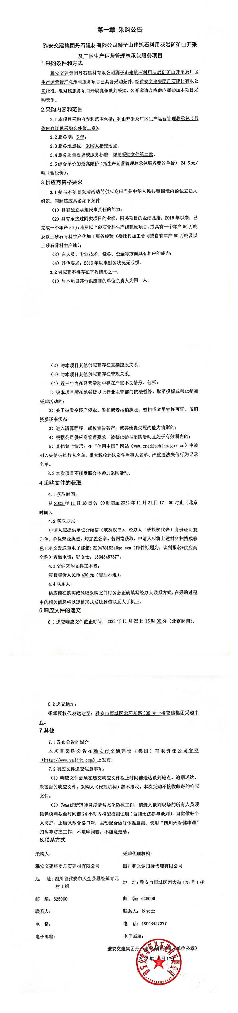 雅安交建集團(tuán)丹石建材有限公司獅子山建筑石料用灰?guī)r礦礦山開采及廠區(qū)生產(chǎn)運(yùn)營(yíng)管理總承包服務(wù)項(xiàng)目采購(gòu)公告