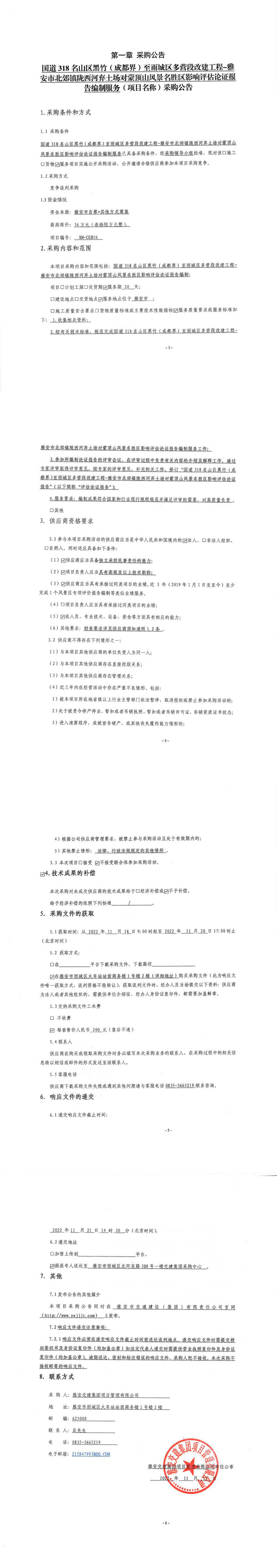 雅安交建集團(tuán)項(xiàng)目管理有限公司國道318名山區(qū)黑竹(成都界)至雨城區(qū)多營(yíng)段改建工程-雅安市北郊鎮(zhèn)隴西河棄土場(chǎng)對(duì)蒙頂山風(fēng)景名勝區(qū)影響評(píng)估論證報(bào)告編制服務(wù)采購公告