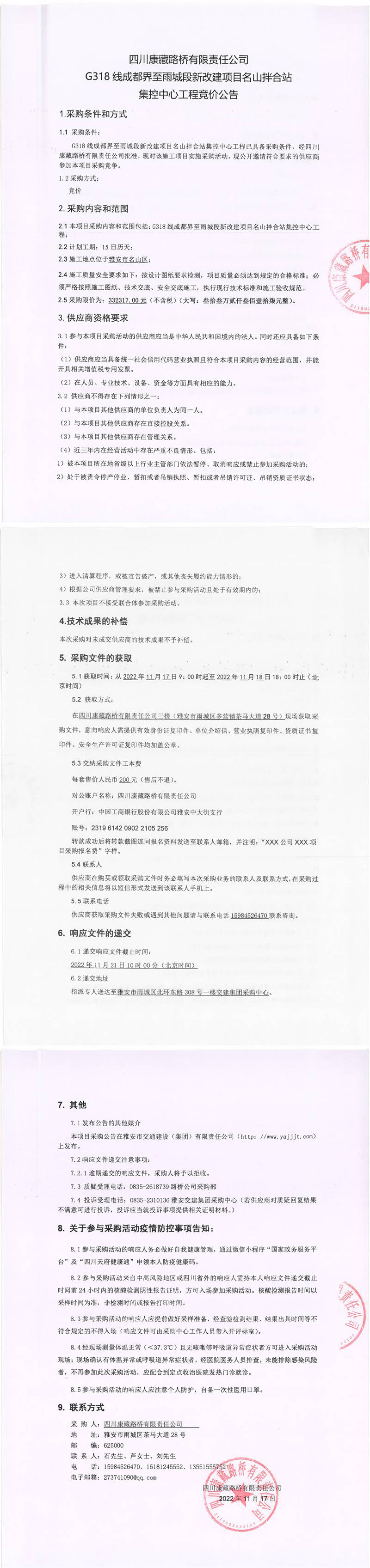 四川康藏路橋有限責(zé)任公司G318線成都界至雨城段新改建項(xiàng)目名山拌合站集控中心工程競價(jià)公告