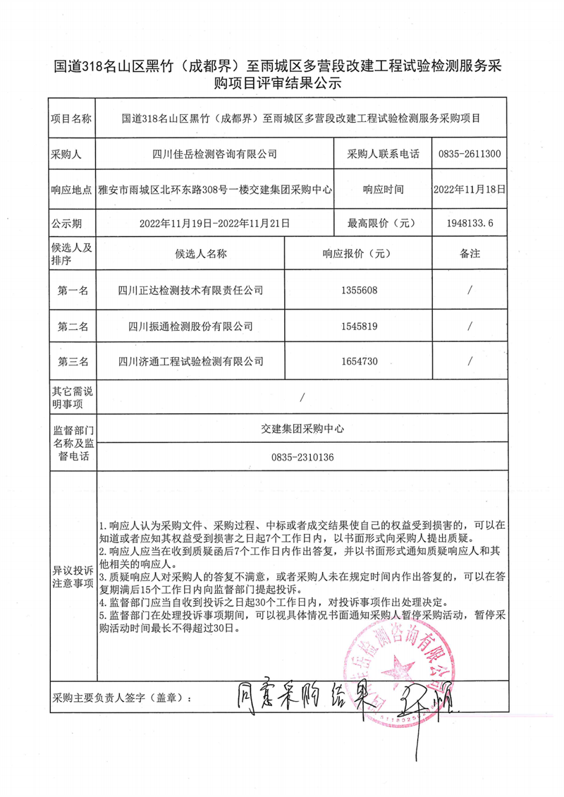 四川佳岳檢測(cè)咨詢有限公司國道318名山區(qū)黑竹(成都界)至雨城區(qū)多營段改建工程試驗(yàn)檢測(cè)服務(wù)采購項(xiàng)目評(píng)審結(jié)果公示