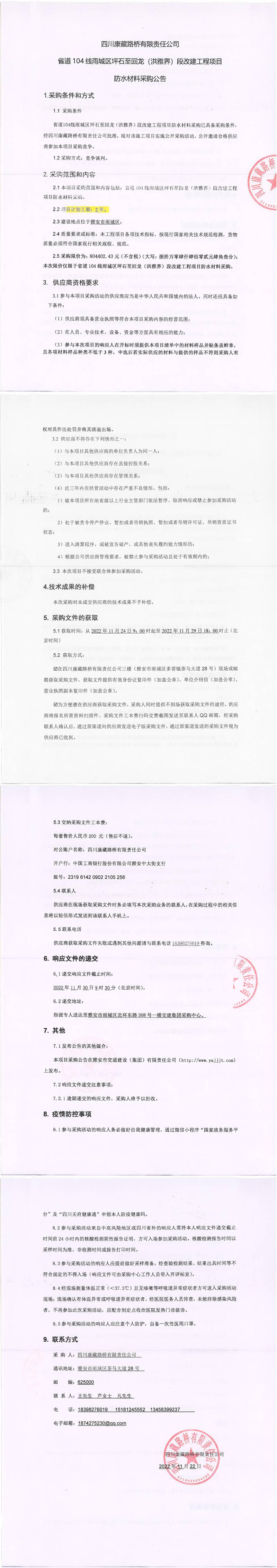 四川康藏路橋有限責(zé)任公司省道104雨城區(qū)坪石至回龍(洪雅界)段改建工程項(xiàng)目防水材料采購(gòu)公告