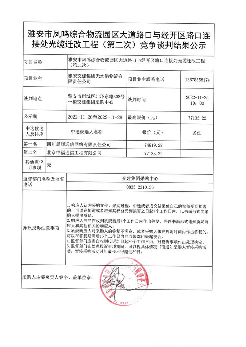 雅安交建集團(tuán)無水港物流有限責(zé)任公司雅安市鳳鳴綜合物流園區(qū)大道路口與經(jīng)開區(qū)路口連接處光纜遷改工程(第二次)競爭談判結(jié)果公示