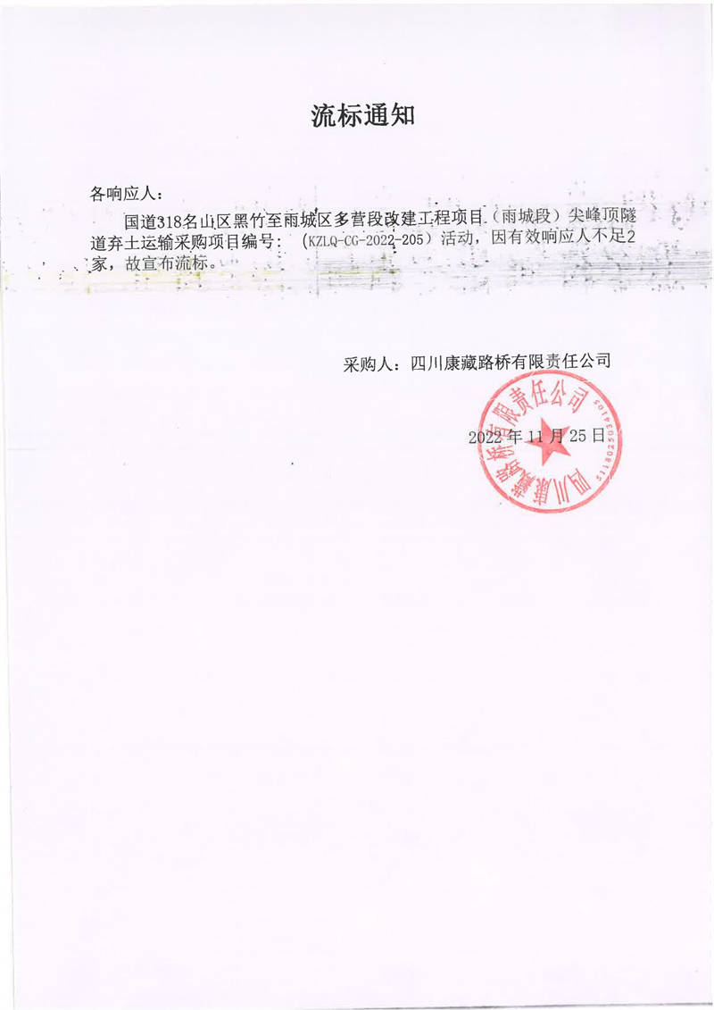 四川康藏路橋有限責(zé)任公司國(guó)道318名山區(qū)黑竹至雨城區(qū)多營(yíng)段改建工程項(xiàng)目(雨城段)尖峰頂隧道棄土運(yùn)輸采購(gòu)項(xiàng)目流標(biāo)通知