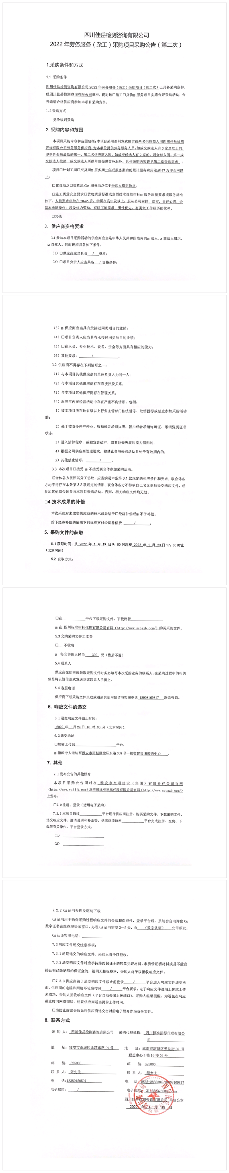 四川佳岳檢測咨詢有限公司2022年勞務(wù)服務(wù)(雜工)采購項目采購公告(第二次)