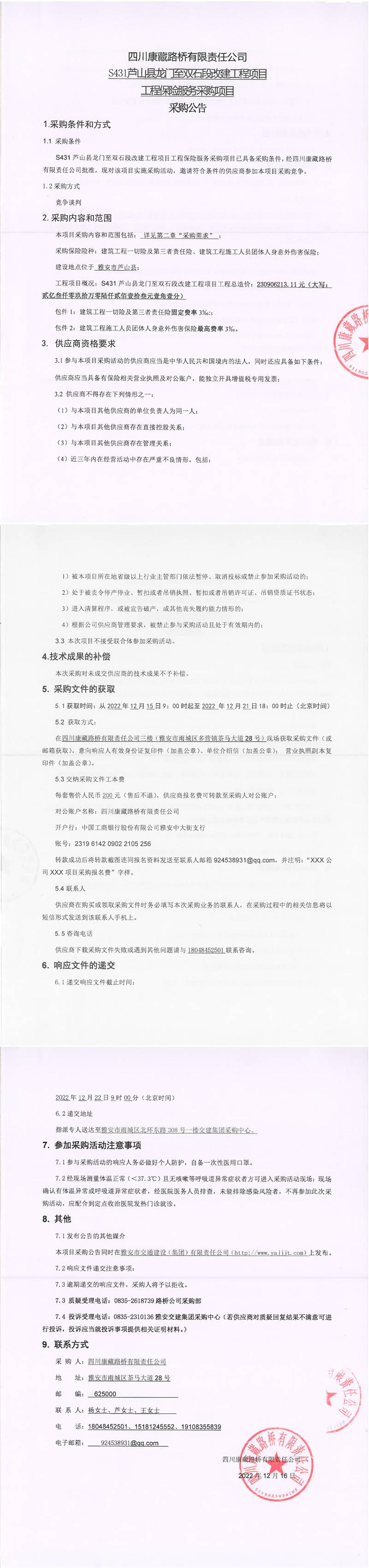 四川康藏路橋有限責(zé)任公司S431蘆山縣龍門至雙石段改建工程項目工程保險服務(wù)采購項目采購公告