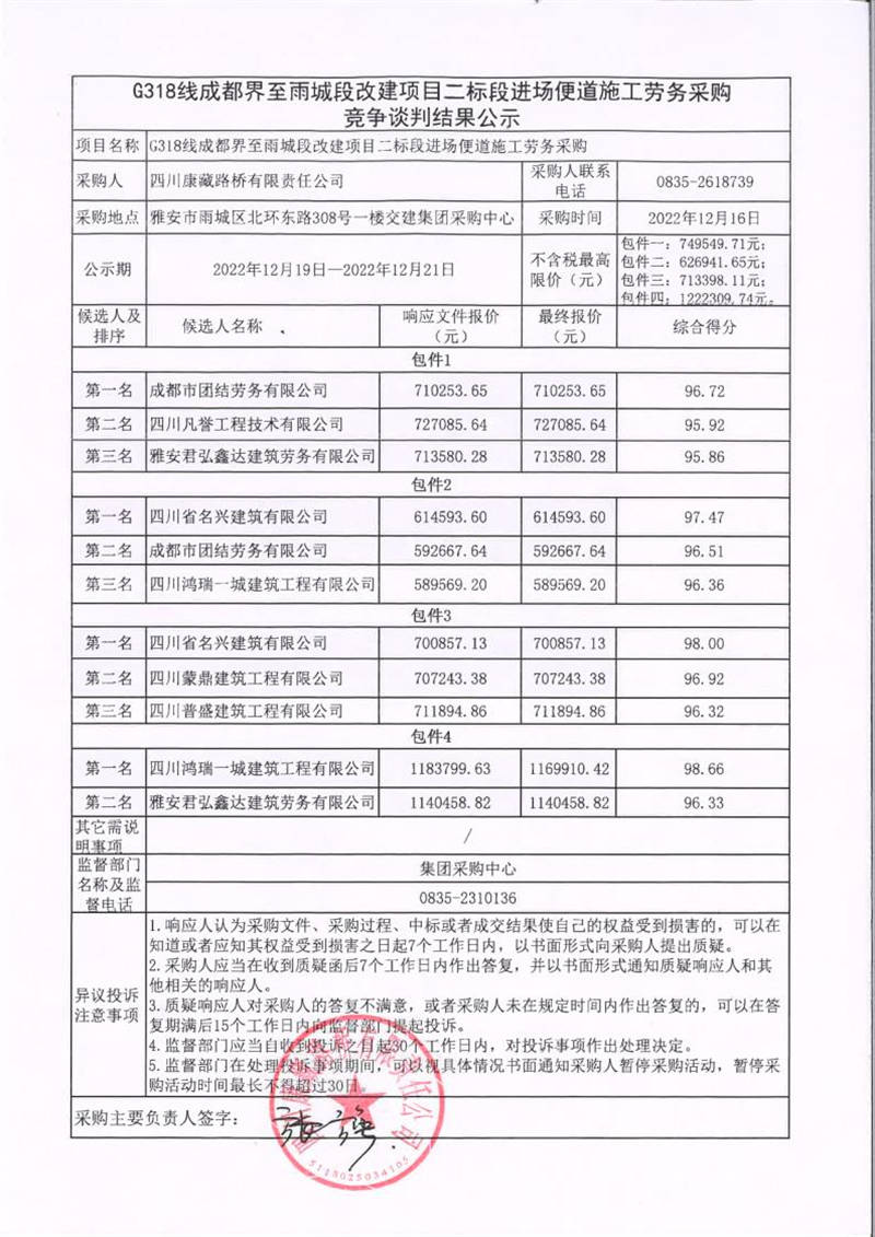 四川康藏路橋有限責(zé)任公司G318線成都界至雨城段改建項(xiàng)目二標(biāo)段進(jìn)場便道施工勞務(wù)采購競爭談判結(jié)果公示