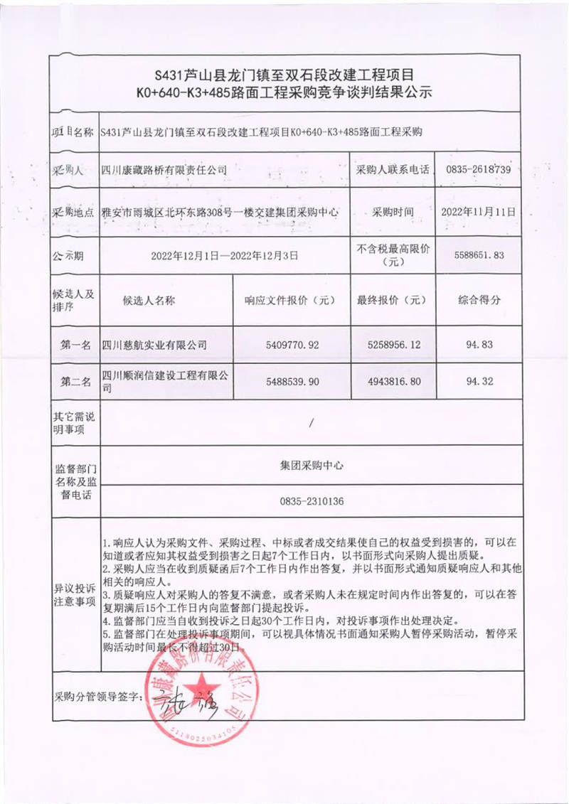 四川康藏路橋有限責(zé)任公司S431蘆山縣龍門鎮(zhèn)至雙石段改建工程項目K0+640-K3+485路面工程采購競爭談判結(jié)果公示