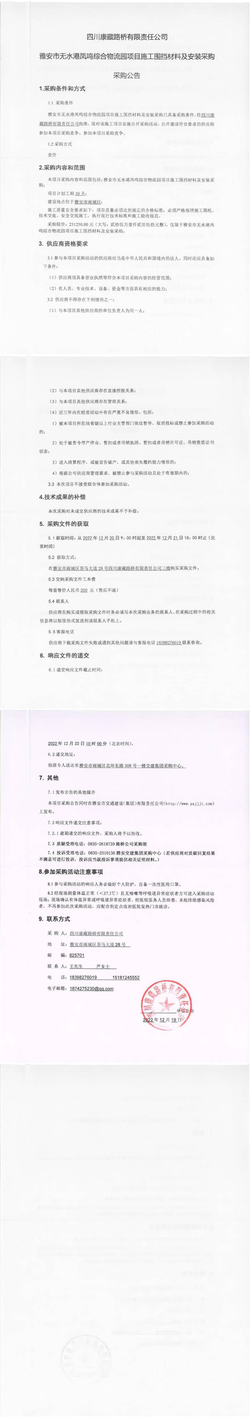 四川康藏路橋有限責(zé)任公司雅安市無(wú)水港鳳鳴綜合物流園項(xiàng)目施工圍擋材料及安裝采購(gòu)采購(gòu)公告