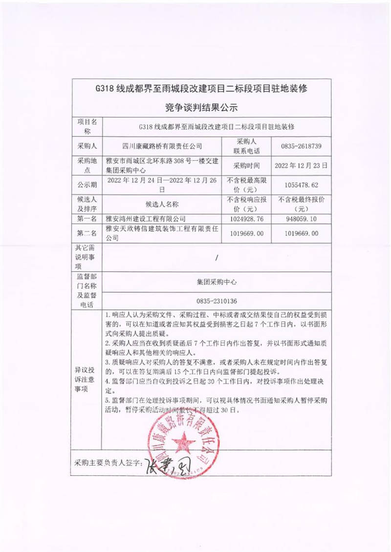 四川康藏路橋有限責任公司G318線成都界至雨城段改建項目二標段項目駐地裝修競爭談判結(jié)果公示
