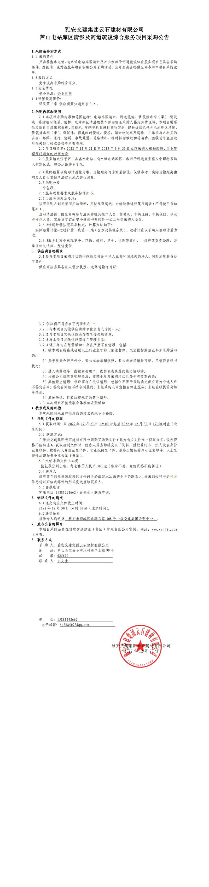 雅安交建集團云石建材有限公司蘆山電站庫區(qū)清淤及河道疏浚綜合服務項目采購公告
