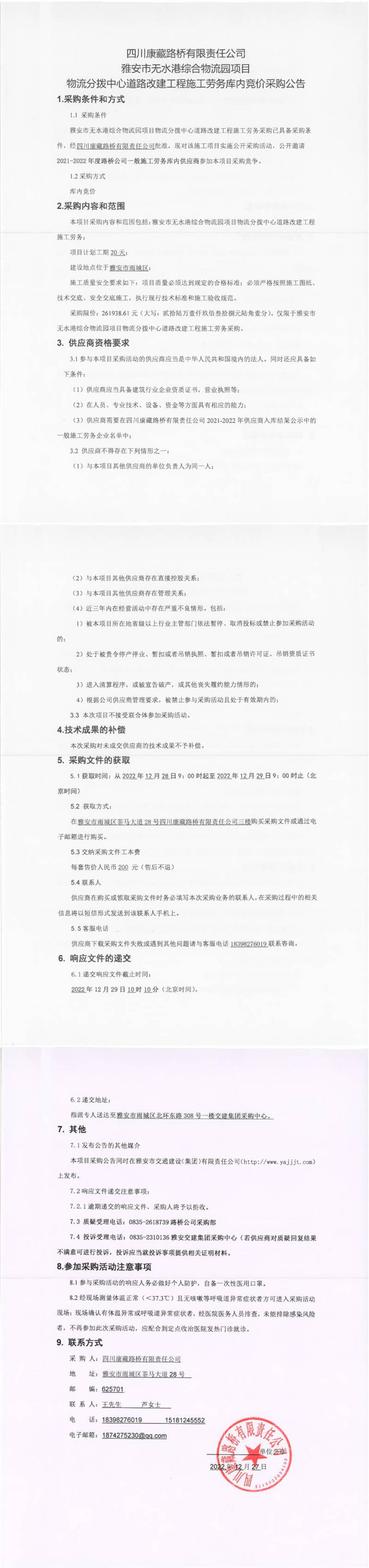 四川康藏路橋有限責任公司雅安市無水港綜合物流園項目物流分撥中心道路改建工程施工勞務庫內競價采購公告