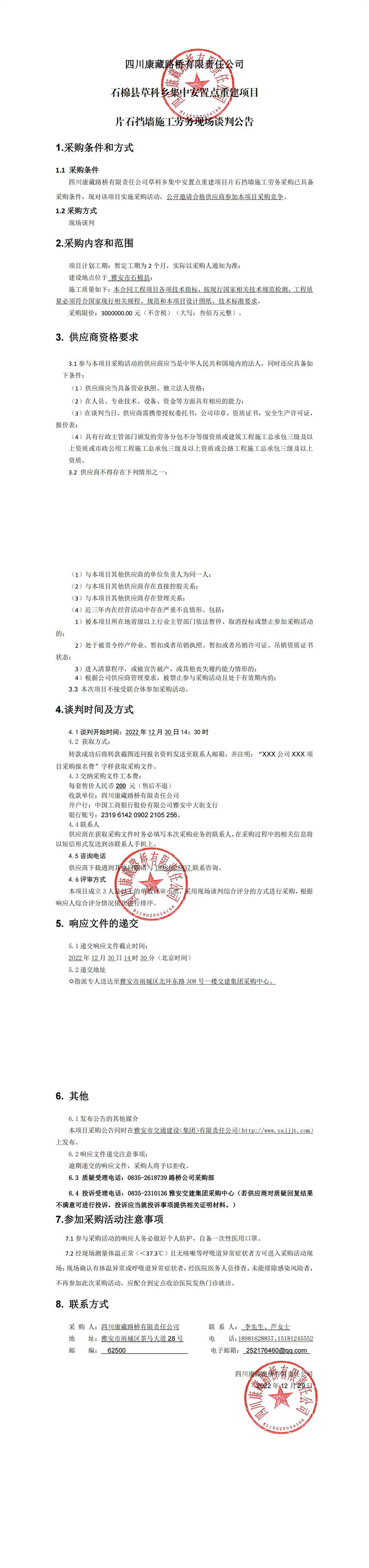 四川康藏路橋有限責(zé)任公司石棉縣草科鄉(xiāng)集中安置點重建項目片石擋墻施工勞務(wù)現(xiàn)場談判公告