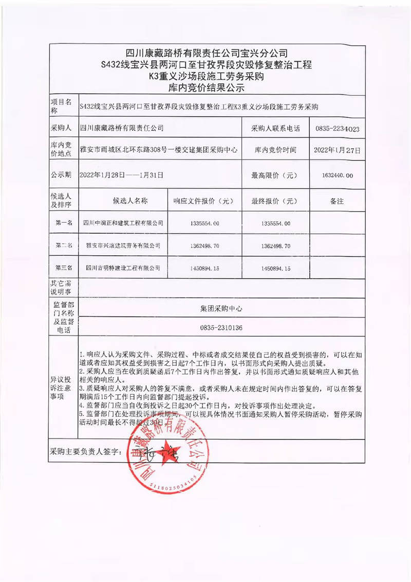 四川康藏路橋有限責(zé)任公司寶興分公司S432線寶興縣兩河口至甘孜界段災(zāi)毀修復(fù)整治工程K3重義沙場(chǎng)段施工勞務(wù)采購庫內(nèi)競(jìng)價(jià)結(jié)果公示