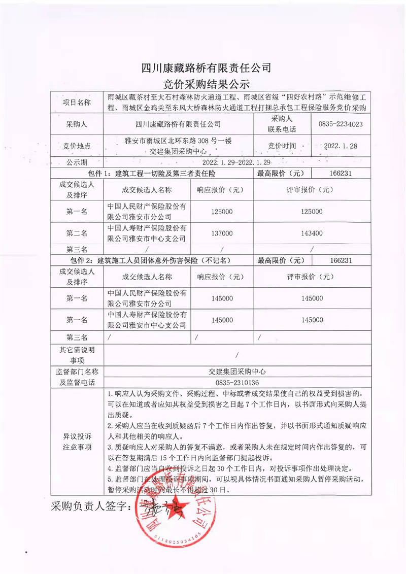 四川康藏路橋有限責(zé)任公司雨城區(qū)藏茶村至大石村森林防火通道工程、雨城區(qū)省級“四好農(nóng)村路”示范維修工程、雨城區(qū)金雞關(guān)至東風(fēng)大橋森林防火通道工程打捆總承包工程保險服務(wù)競價采購結(jié)果公示