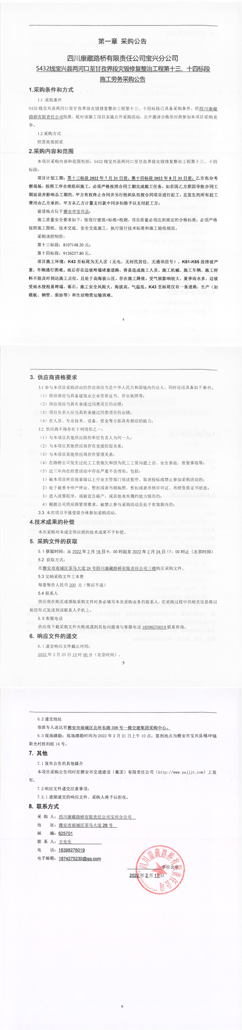 四川康藏路橋有限責(zé)任公司S432線寶興縣兩河口至甘孜界段災(zāi)毀修復(fù)整治工程第十三、十四標(biāo)段施工勞務(wù)采購(gòu)公告
