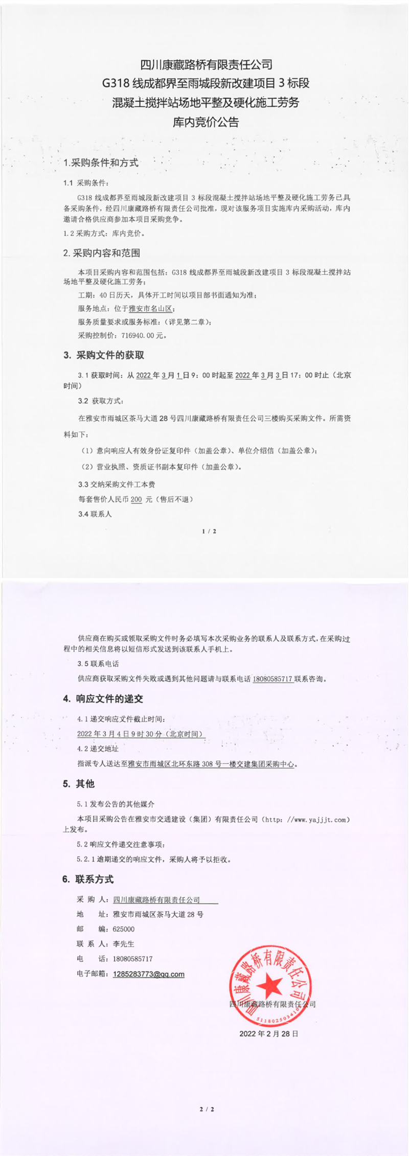 四川康藏路橋有限責(zé)任公司G318線成都界至雨城段新改建項(xiàng)目3標(biāo)段混凝土攪拌站場(chǎng)地平整及硬化施工勞務(wù)庫內(nèi)競(jìng)價(jià)公告