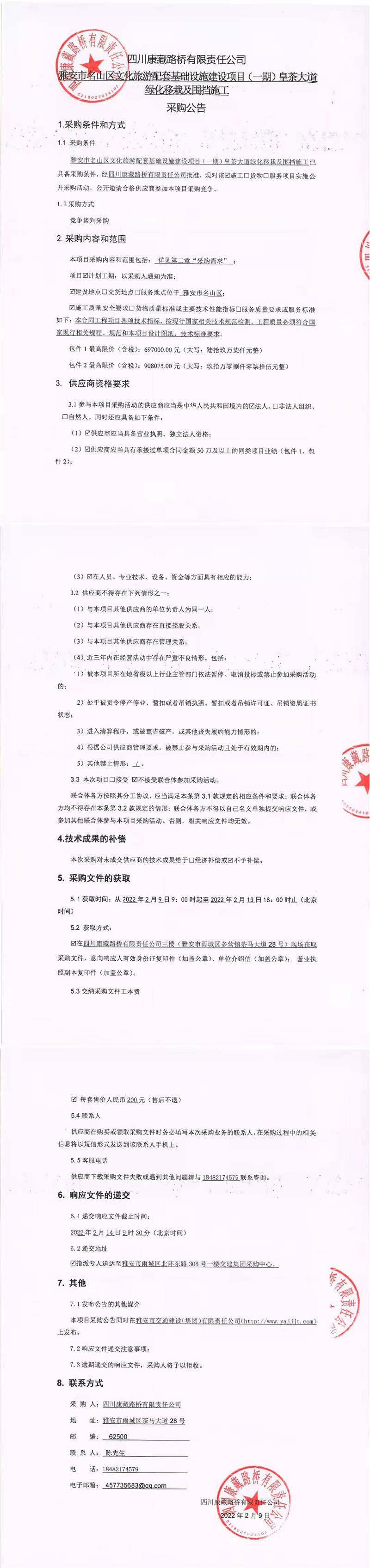 四川康藏路橋有限責(zé)任公司雅安市名山區(qū)文化旅游配套基礎(chǔ)設(shè)施建設(shè)項目(一期)皇茶大道綠化移栽及圍擋施工采購公告