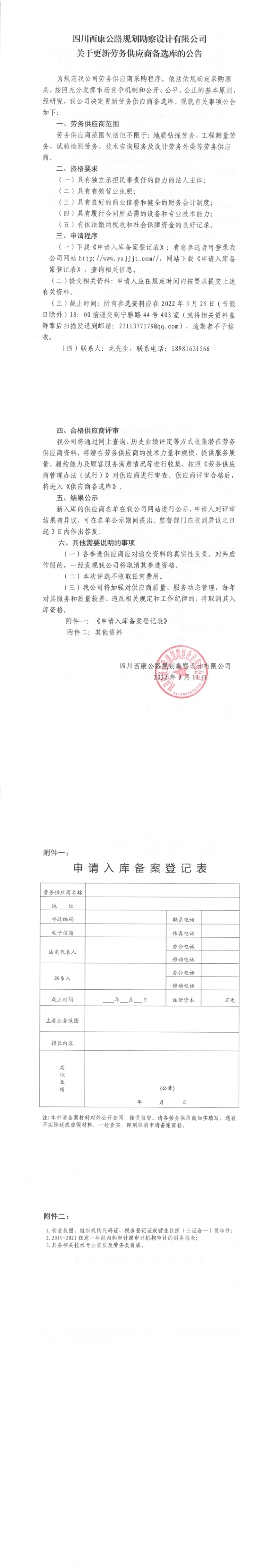 四川西康公路規(guī)劃勘察設計有限公司關于更新勞務供應商備選庫的公告