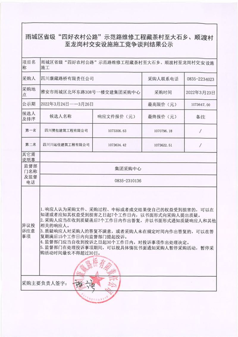 四川康藏路橋有限責(zé)任公司雨城區(qū)省級“四好農(nóng)村公路”示范路維修工程藏茶村至大石鄉(xiāng)、順渡村至龍崗村交安設(shè)施施工競爭談判結(jié)果公示