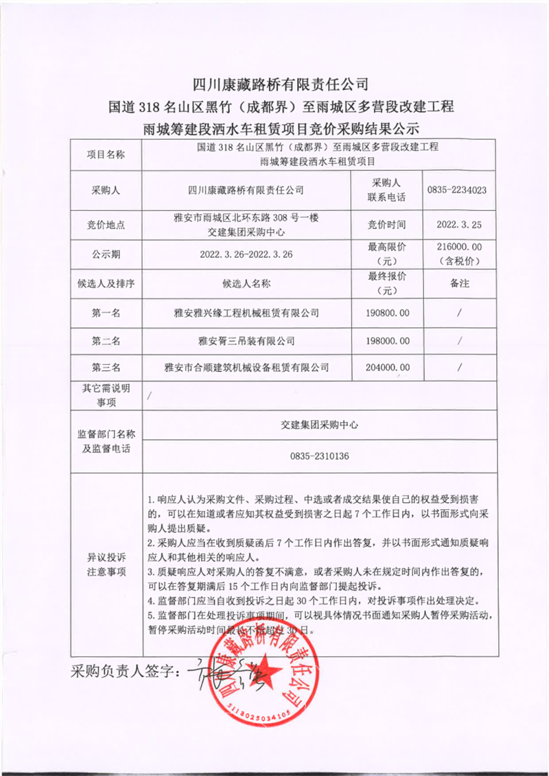 四川康藏路橋有限責(zé)任公司國(guó)道318名山區(qū)黑竹(成都界)至雨城區(qū)多營(yíng)段改建工程雨城籌建段灑水車租賃項(xiàng)目競(jìng)價(jià)采購(gòu)結(jié)果公示