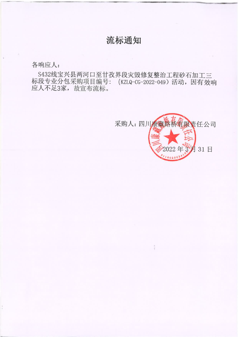 四川康藏路橋有限責(zé)任公司S432線寶興縣兩河口至甘孜界段災(zāi)毀修復(fù)整治工程砂石加工三標(biāo)段專業(yè)分包采購項目流標(biāo)通知