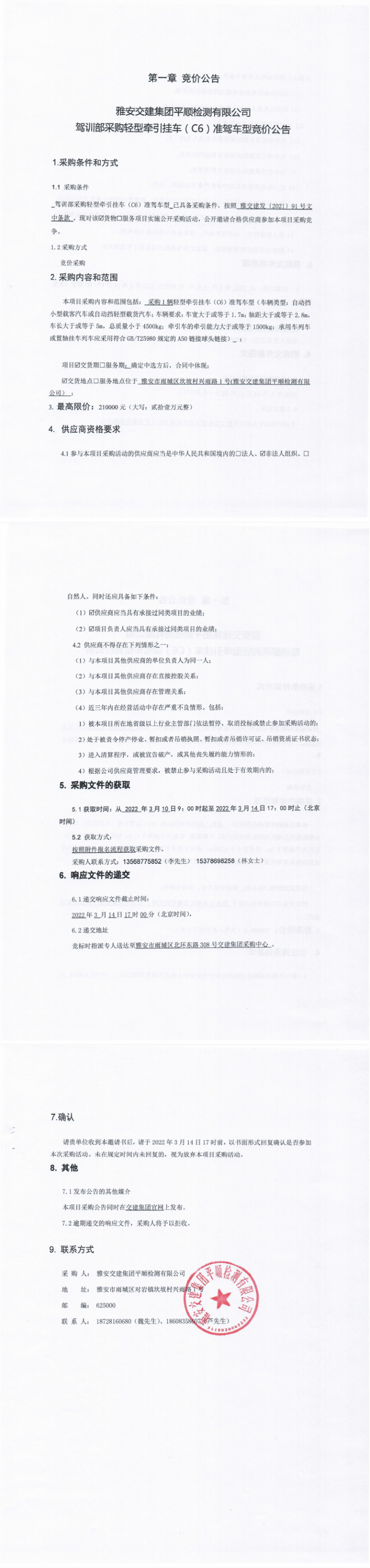 雅安交建集團(tuán)平順檢測有限公司駕訓(xùn)部采購輕型牽引掛車(C6)準(zhǔn)駕車型競價(jià)公告