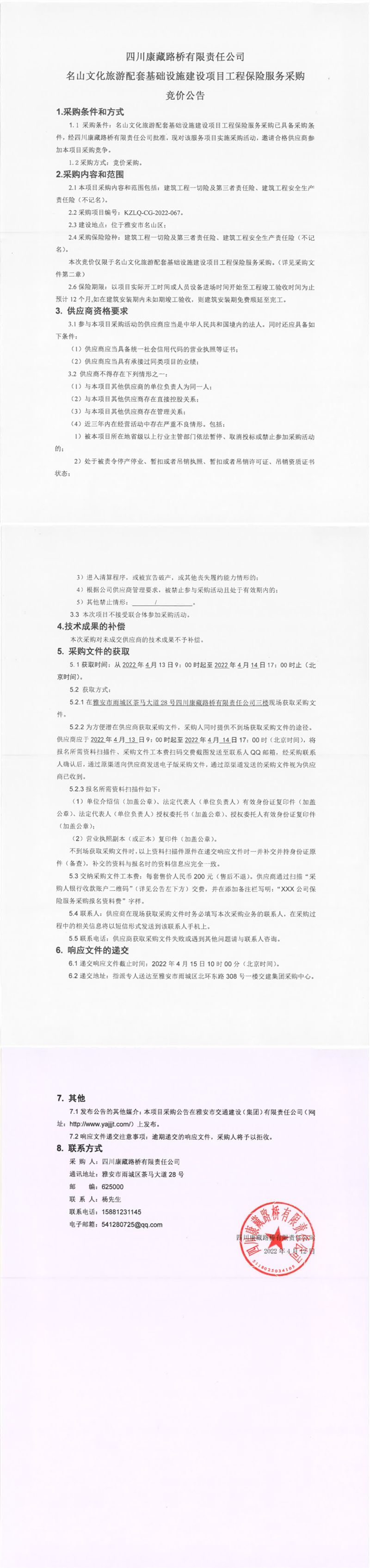 四川康藏路橋有限責(zé)任公司名山文化旅游配套基礎(chǔ)設(shè)施建設(shè)項(xiàng)目工程保險(xiǎn)服務(wù)采購(gòu)競(jìng)價(jià)公告