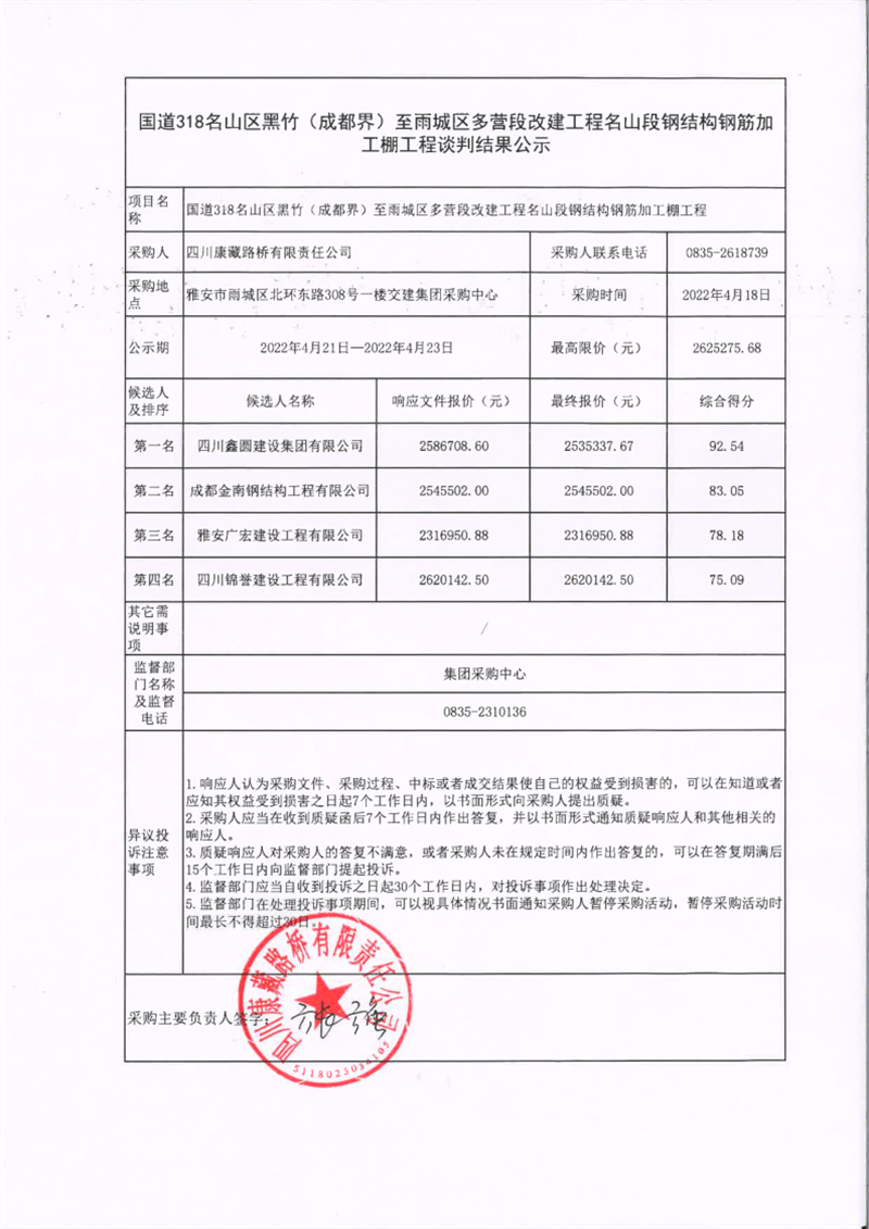 四川康藏路橋有限責(zé)任公司國道318名山區(qū)黑竹(成都界)至雨城區(qū)多營段改建工程名山段鋼結(jié)構(gòu)鋼筋加工棚工程談判結(jié)果公示