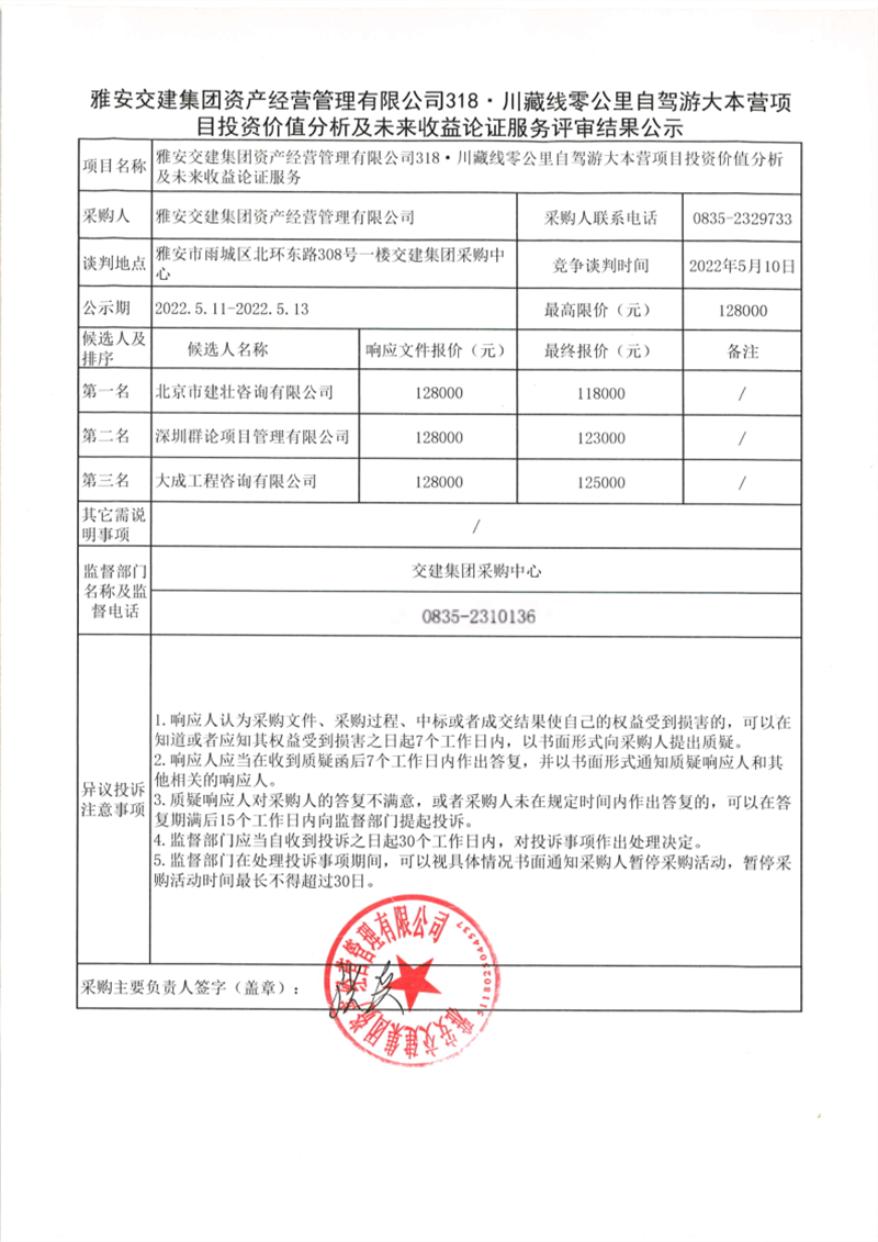 雅安交建集團(tuán)資產(chǎn)經(jīng)營管理有限公司318·川藏線零公里自駕游大本營項目投資價值分析及未來收益論證服務(wù)評審結(jié)果公示