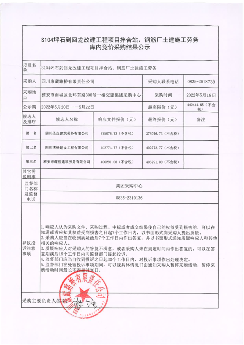 四川康藏路橋有限責(zé)任公司S104坪石到回龍改建工程項(xiàng)目拌合站、鋼筋廠土建施工勞務(wù)庫內(nèi)競價(jià)采購結(jié)果公示