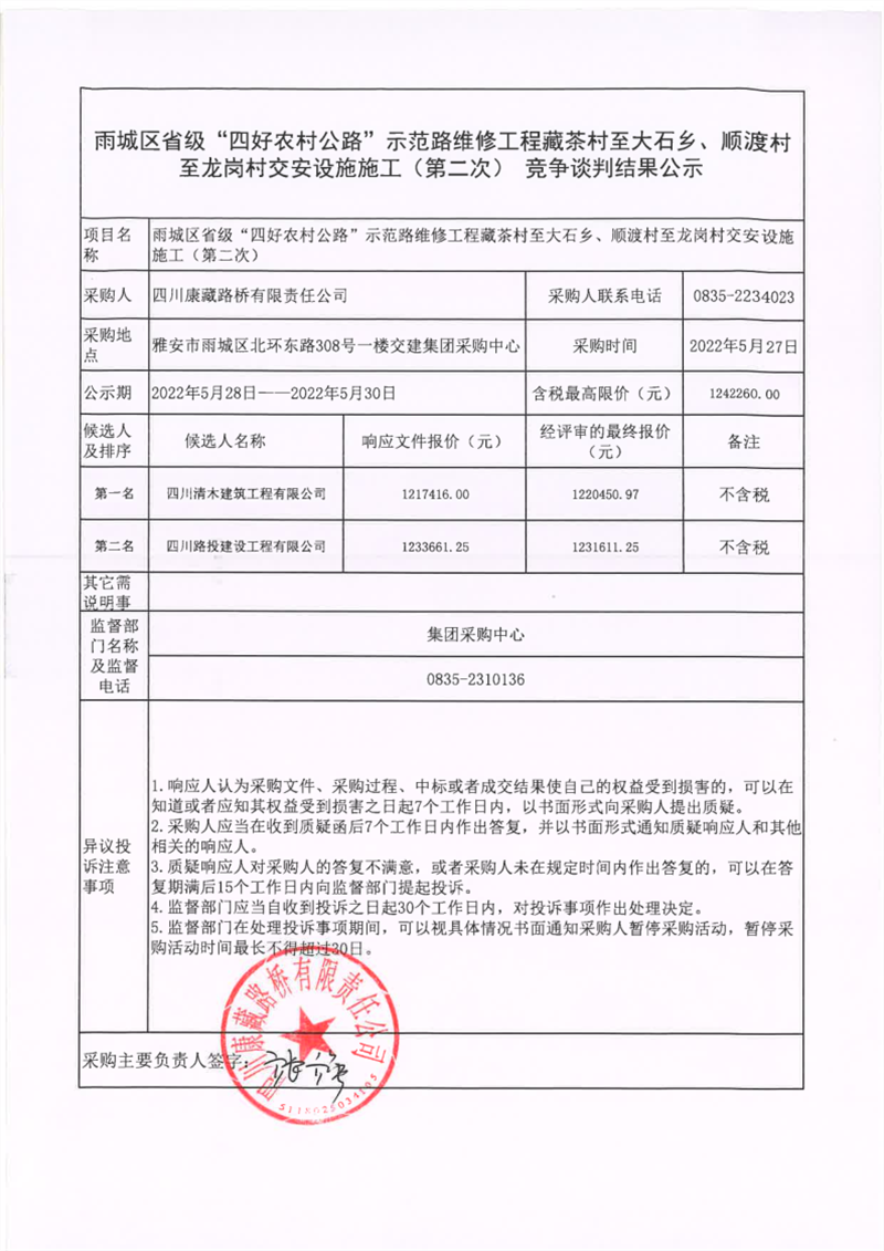 四川康藏路橋有限責(zé)任公司雨城區(qū)省級(jí)“四好農(nóng)村公路”示范路維修工程藏茶村至大石鄉(xiāng)、順渡村至龍崗村交安設(shè)施施工(第二次)競(jìng)爭(zhēng)談判結(jié)果公示