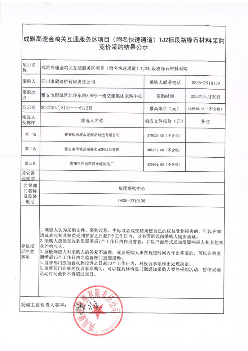 四川康藏路橋有限責(zé)任公司成雅高速金雞關(guān)互通服務(wù)區(qū)項(xiàng)目(雨名快速通道)TJ2標(biāo)段路緣石材料采購競價(jià)采購結(jié)果公示