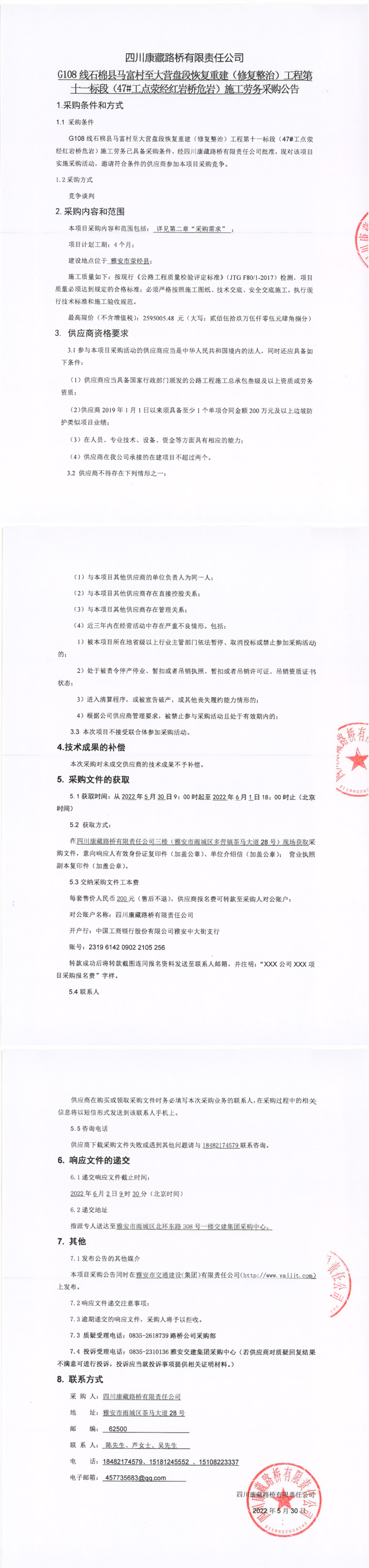 四川康藏路橋有限責(zé)任公司G108線(xiàn)石棉縣馬富村至大營(yíng)盤(pán)段恢復(fù)重建(修復(fù)整治)工程第十一標(biāo)段(47#工點(diǎn)滎經(jīng)紅巖橋危巖)施工勞務(wù)采購(gòu)公告