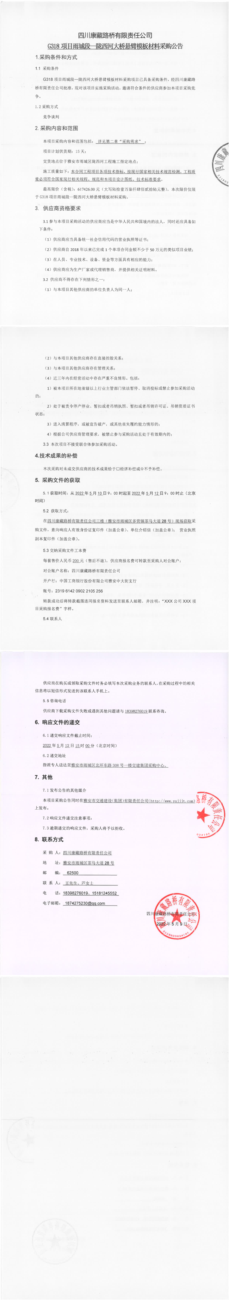 四川康藏路橋有限責(zé)任公司G318項(xiàng)目雨城段-隴西河大橋懸臂模板材料采購(gòu)公告