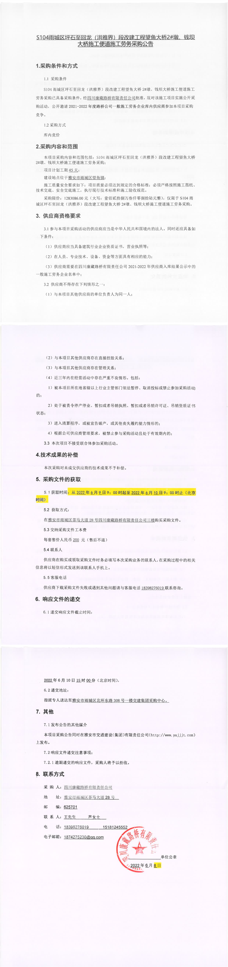四川康藏路橋有限責(zé)任公司S104雨城區(qū)坪石至回龍(洪雅界)段改建工程望魚大橋2#墩、錢壩大橋施工便道施工勞務(wù)采購公告