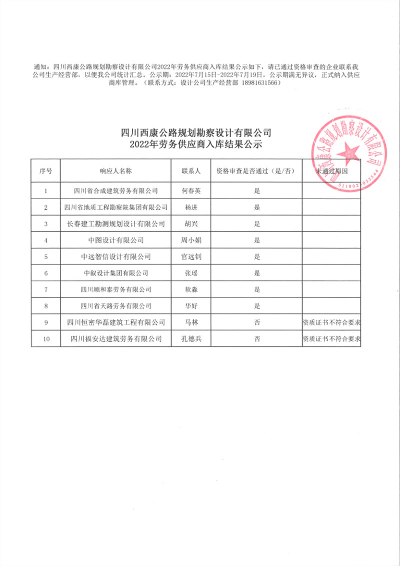 四川西康公路規(guī)劃勘察設(shè)計(jì)有限公司2022年勞務(wù)供應(yīng)商入庫(kù)結(jié)果公示