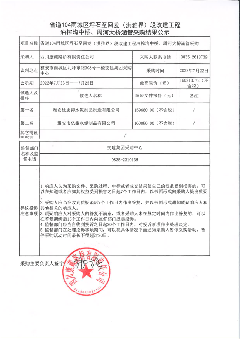 四川康藏路橋有限責任公司省道104雨城區(qū)坪石至回龍(洪雅界)段改建工程油榨溝中橋、周河大橋涵管采購結果公示