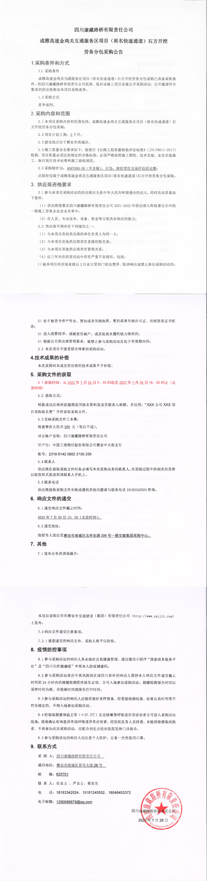 四川康藏路橋有限責任公司成雅高速金雞關互通及服務區(qū)項目(雨名快速通道)石方開挖勞務分包采購公告