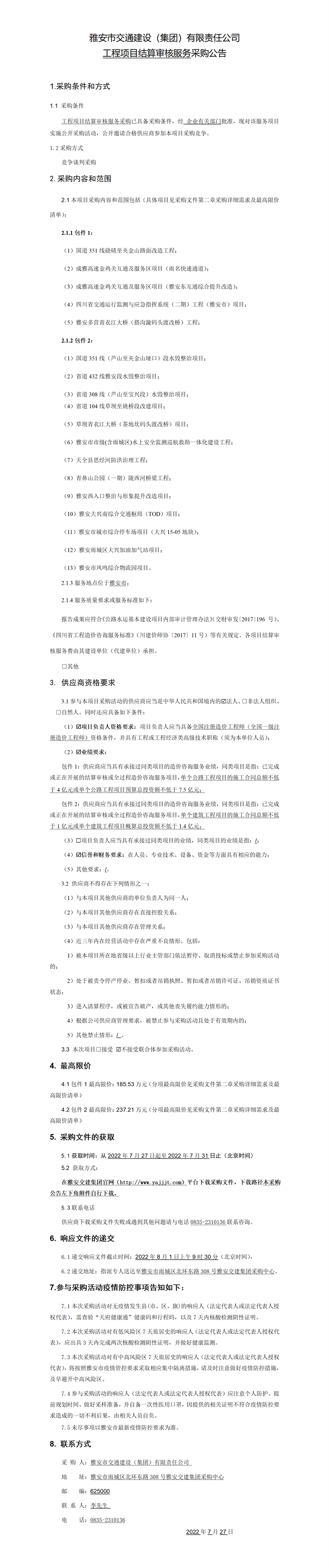 雅安市交通建設(shè)(集團)有限責(zé)任公司工程項目結(jié)算審核服務(wù)采購公告
