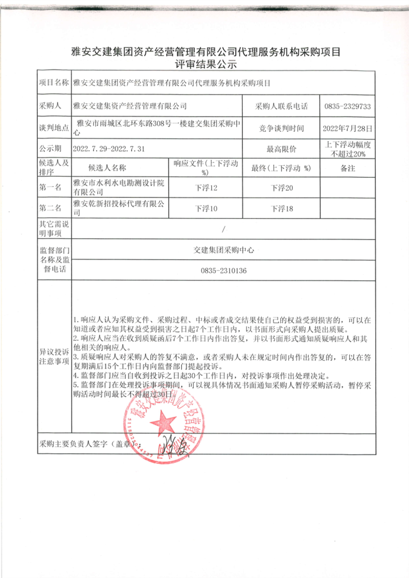 雅安交建集團資產(chǎn)經(jīng)營管理有限公司代理服務機構采購項目評審結果公示