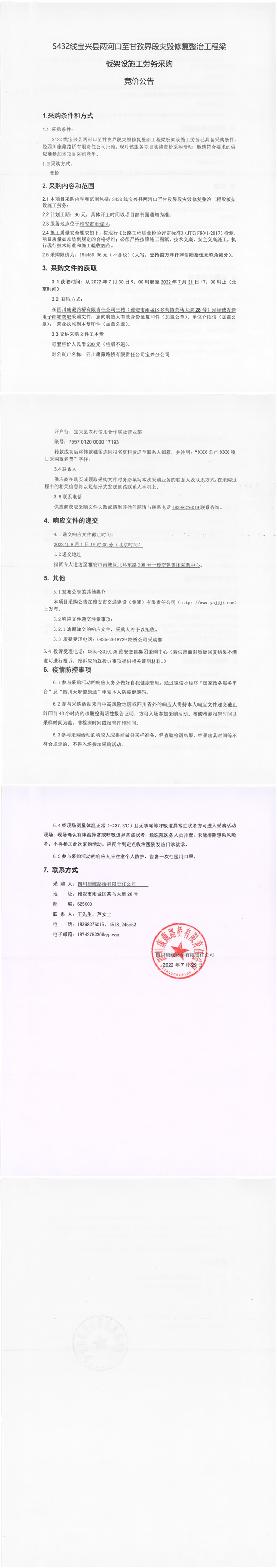 四川康藏路橋有限責任公司S432線寶興縣兩河口至甘孜界段災毀修復整治工程梁板架設施工勞務采購競價公告
