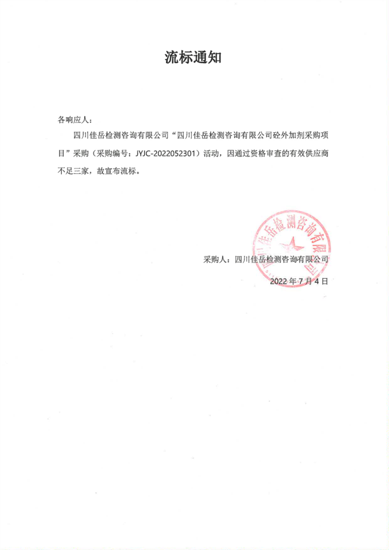 四川佳岳檢測(cè)咨詢有限公司砼外加劑采購項(xiàng)目流標(biāo)通知