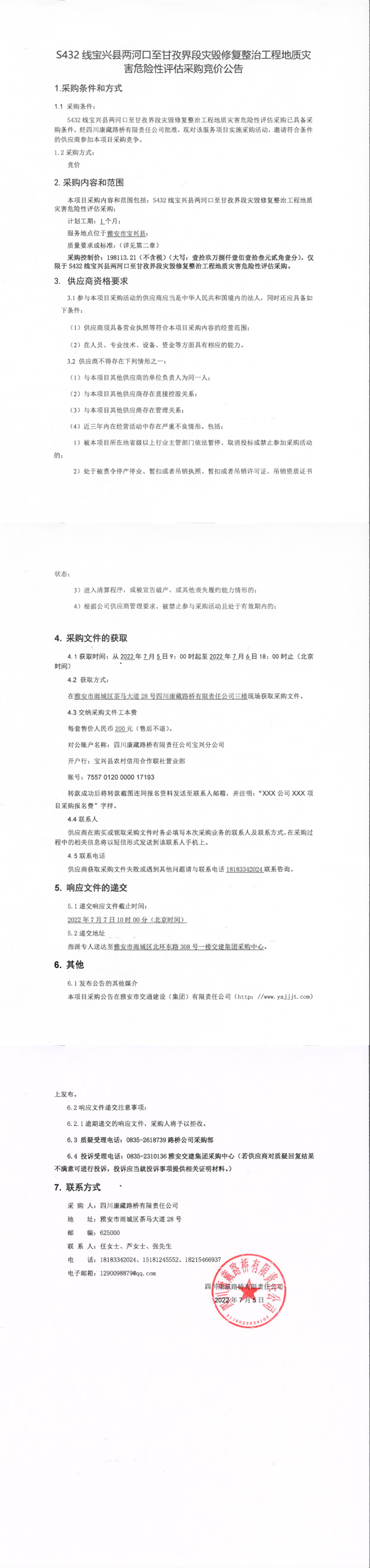 四川康藏路橋有限責任公司S432線寶興縣兩河口至甘孜界段災毀修復整治工程地質災害危險性評估采購競價公告