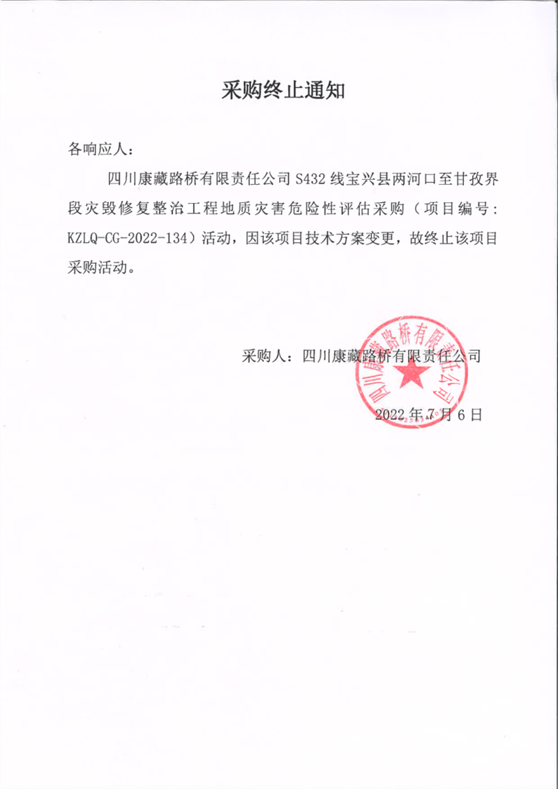 四川康藏路橋有限責(zé)任公司S432線寶興縣兩河口至甘孜界段災(zāi)毀修復(fù)整治工程地質(zhì)災(zāi)害危險(xiǎn)性評估采購終止通知