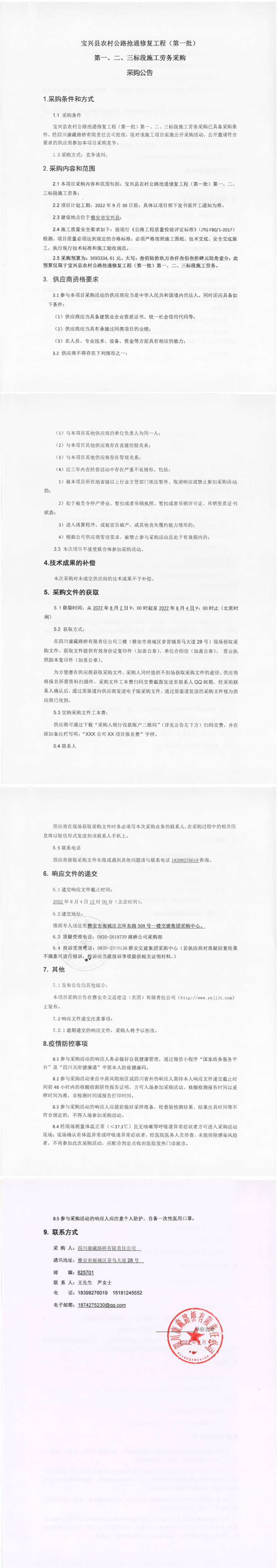 四川康藏路橋有限責任公司寶興縣農(nóng)村公路搶通修復工程(第一批)第一、二、三標段施工勞務(wù)采購采購公告