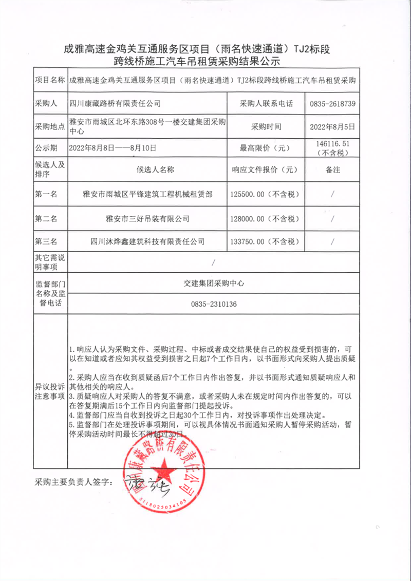 四川康藏路橋有限責(zé)任公司成雅高速金雞關(guān)互通服務(wù)區(qū)項(xiàng)目(雨名快速通道)TJ2標(biāo)段跨線橋施工汽車(chē)吊租賃采購(gòu)結(jié)果公示