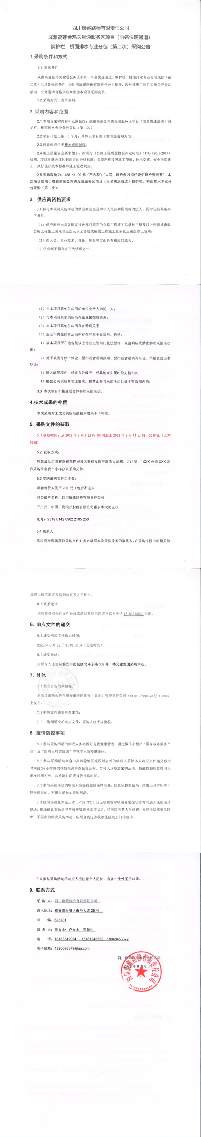 四川康藏路橋有限責(zé)任公司成雅高速金雞關(guān)互通服務(wù)區(qū)項目(雨名快速通道)鋼護(hù)欄、橋面排水工程專業(yè)分包(第二次)采購公告
