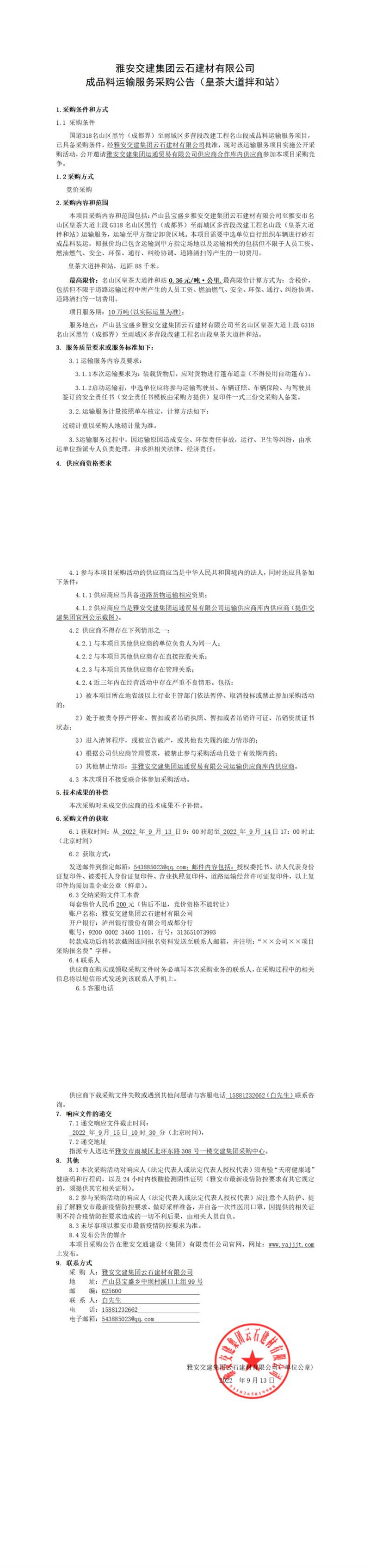 雅安交建集團云石建材有限公司成品料運輸服務(wù)采購公告(皇茶大道拌和站)