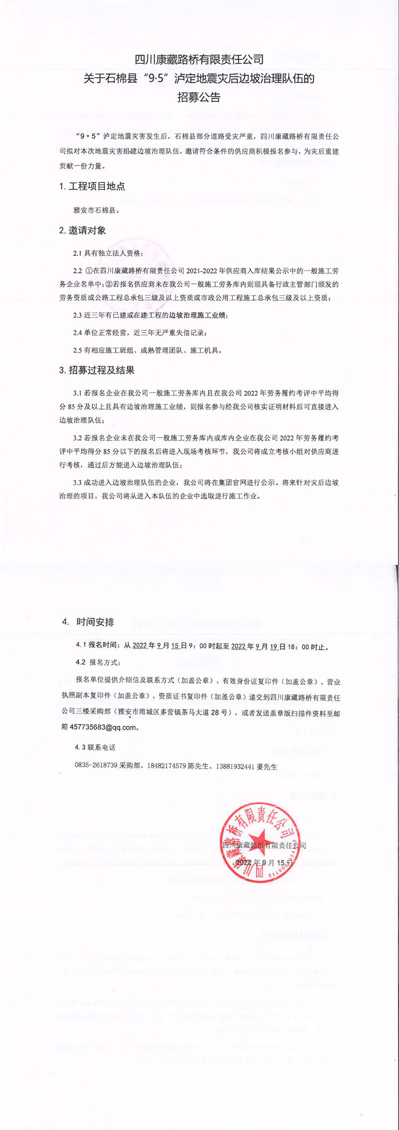 四川康藏路橋有限責(zé)任公司關(guān)于石棉縣“9·5”瀘定地震災(zāi)后邊坡治理隊(duì)伍的招募公告