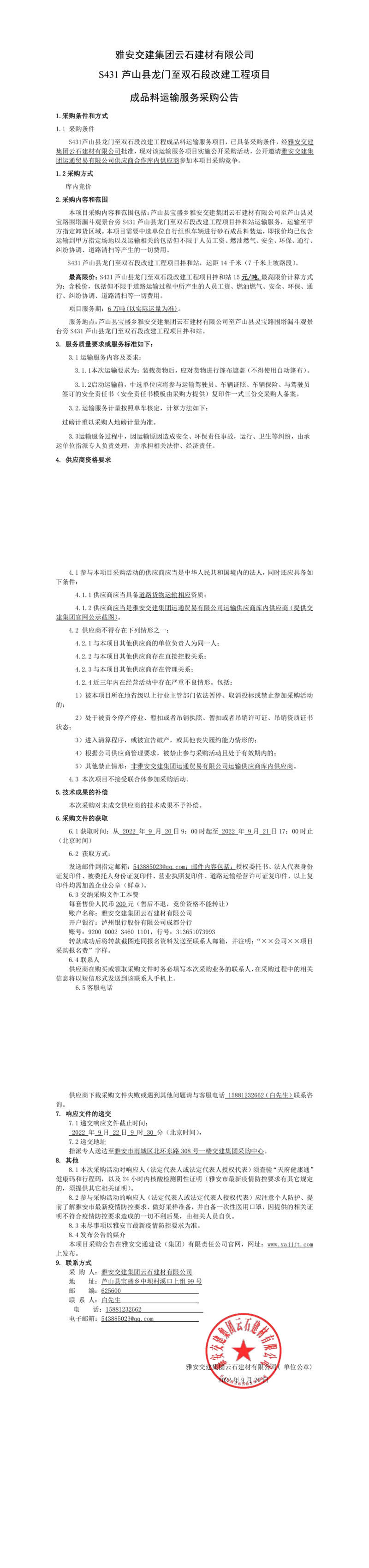 雅安交建集團(tuán)云石建材有限公司S431蘆山縣龍門至雙石段改建工程項目成品料運輸服務(wù)采購公告